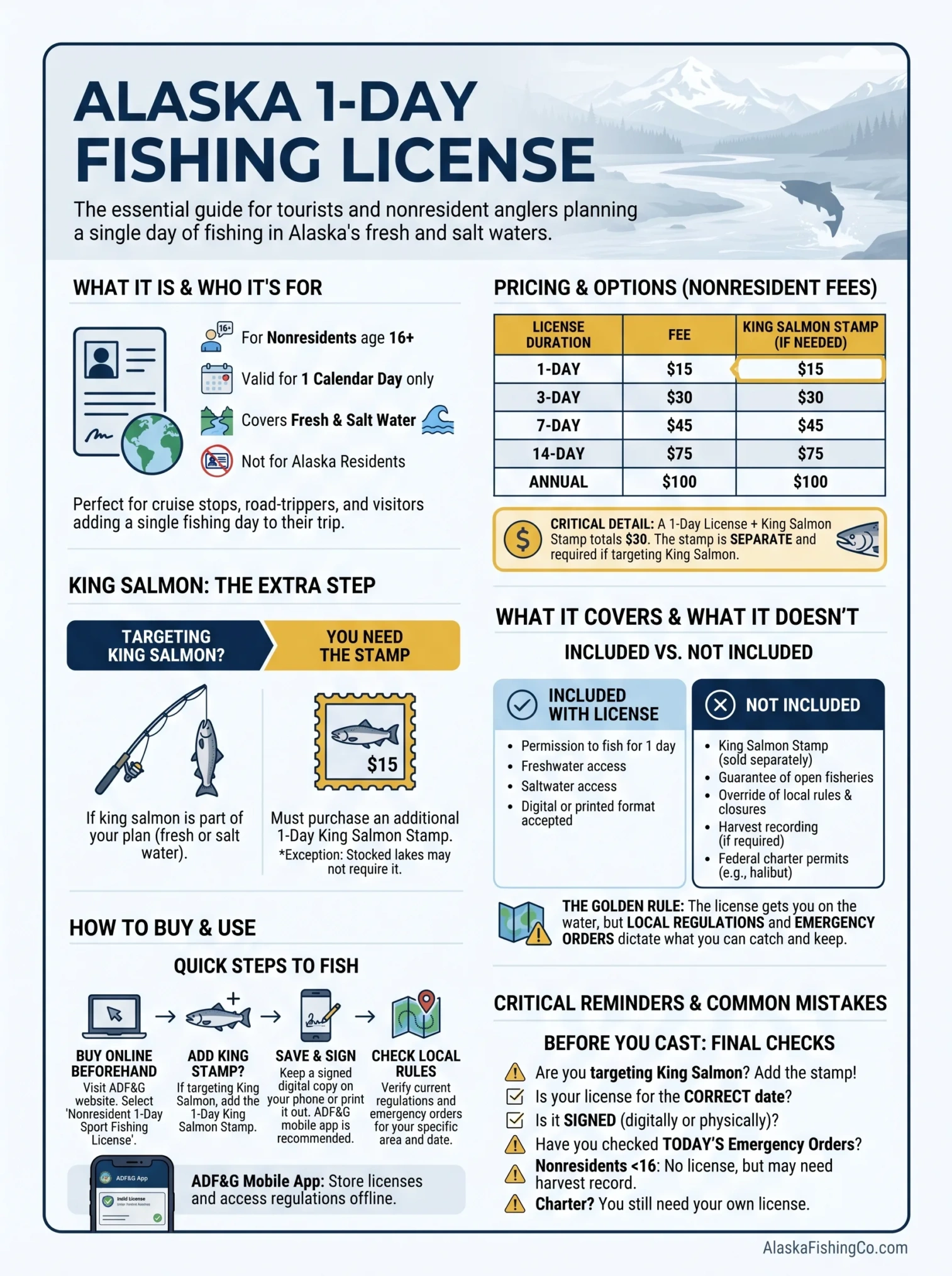 The Alaska 1-day fishing license is the short-term sport fishing license most visitors use when they plan to fish on just one day. The current nonresident fee is $15, and a separate 1-day king salmon stamp is also $15 if king salmon is part of the trip.[b]
